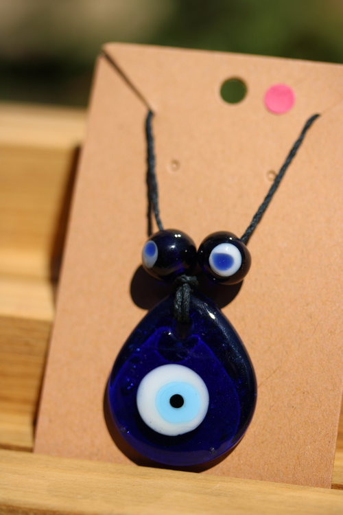 An extremely ancient apotropaic symbol, the "evil eye" talisman is still embedded in many cultures. Said to ward off bad luck and malicious gossip and protect against evil beings, spells, and influences, the "evil eye" has been produced in glass for millennia. The base glass is a transparent, deep blue with contrasting layers of opaque glass forming the eyes. The main pendant is about 1 1/4" tall and the evil eye beads are about 3/8" in diameter. The beads have two eyes apiece, layering in quintuple protection. The black hemp cord is long enough for anyone to pull over their head.